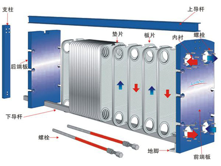 ??3、拆裝清洗方便,甚至可以不必完全拆開僅把壓緊螺栓松開就可抽出板片清洗,更換墊片,更換板片。