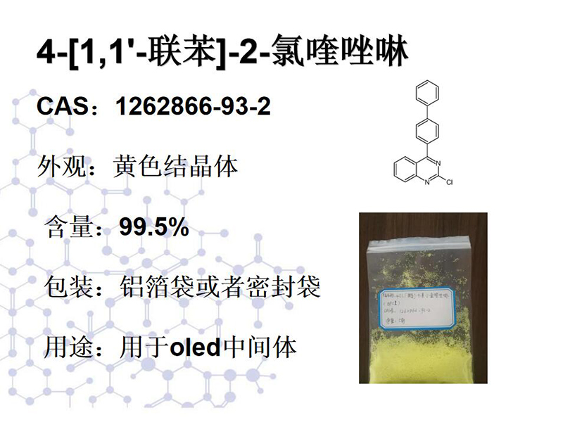 CAS:1262866-93-2 外觀:黃色結(jié)晶體 含量:99.5% 包裝:鋁箔袋或者密封袋 用途:用于oled中間體