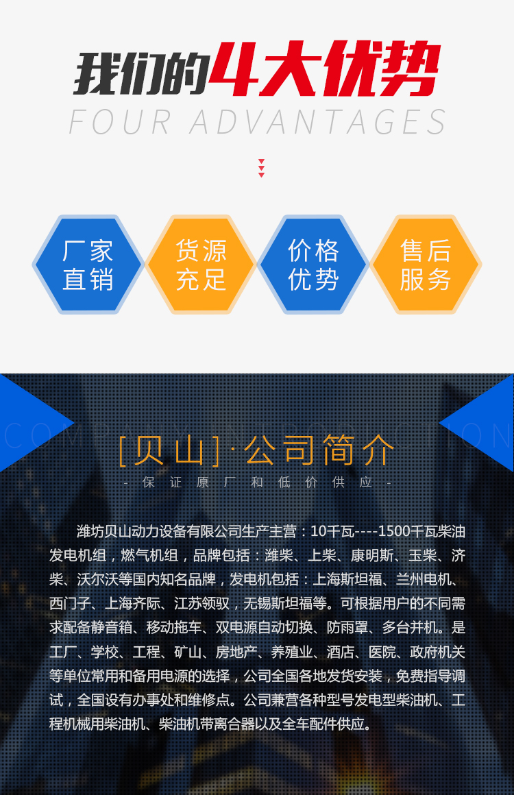 ??感謝您選擇使用濰坊貝山動力設(shè)備有限公司生產(chǎn)的柴油發(fā)電機組。在您選擇使用“貝山”柴油發(fā)電機組的同時,您也就得到了由我們提供的完善的售后服務(wù),以及純正的零配件供應(yīng)。
