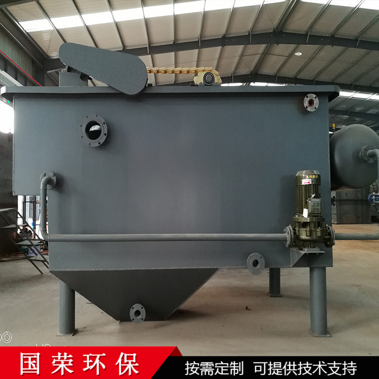 ??經(jīng)加藥反應(yīng)后的污水進(jìn)入氣浮的混合區(qū),與釋放后的溶氣水混合接觸,使絮凝體粘附在細(xì)微氣泡上,然后進(jìn)入氣浮區(qū)。絮凝體在氣浮力的作用下浮向水面形成浮渣,下層的清水經(jīng)集水器流至清水池后,一部分回流作溶氣使用,剩余清水通過溢流口流出。氣浮池水面上的浮渣積聚到一定厚度以后,由刮沫機(jī)刮入氣浮機(jī)污泥池后排出。