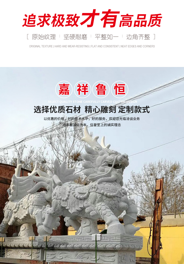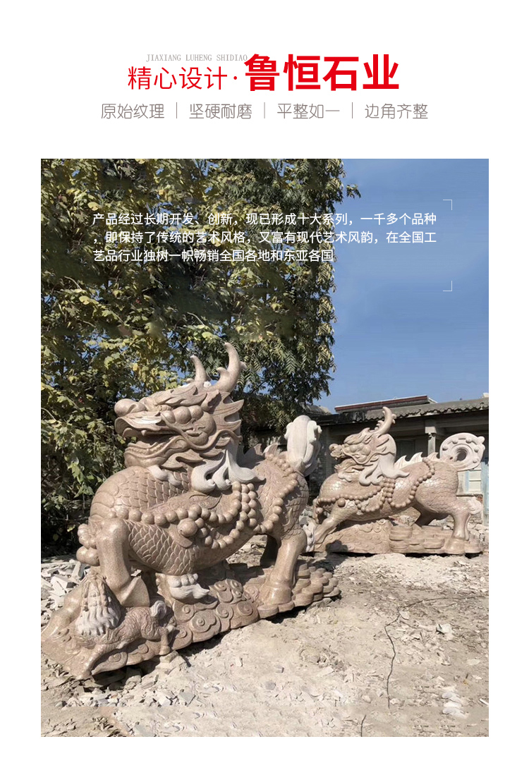 嘉祥魯恒石業有限公司具有圓雕、透雕、線雕、浮雕等多種工藝,可為城市機關、企業、公園、旅游景點、古城古建等部門提供各種適應的石雕藝術品。均采用優良天青石、漢白玉、砂巖、大理石、花崗石、雪花白等石材雕刻成各種世術用品和擺件。例如、歷史人物、神像、花鳥、走獸、香爐、石亭、石塔、石橋、石牌坊、龍柱、燈籠、浮雕、欄桿、石獅、園藝、石桌、石椅、石凳等,可謂琳瑯滿目,品種繁多。產品經過長期開發、創新,現已形成十大系列,一千多個品種,即保持了傳統的藝術風格,又富有現代藝術風韻,在全國工藝品行業獨樹一幟暢銷全國各地和東亞各國。
